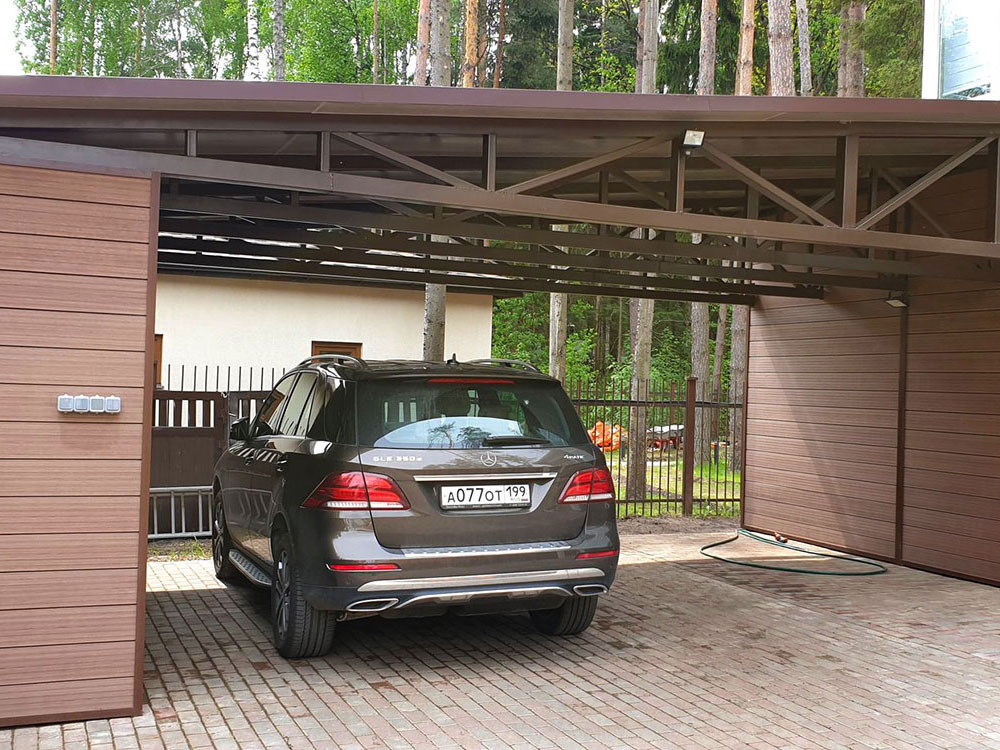 Вот примерно такая задача стояла перед нашими специалистами, решить вопрос обустройства квадратных метров, с максимально продуманным решением. Но и нельзя было забывать о железных конях, которые доставляют гостей. Необходимо было соорудить и обустроить максимально удобно навес, который устраивал всех.